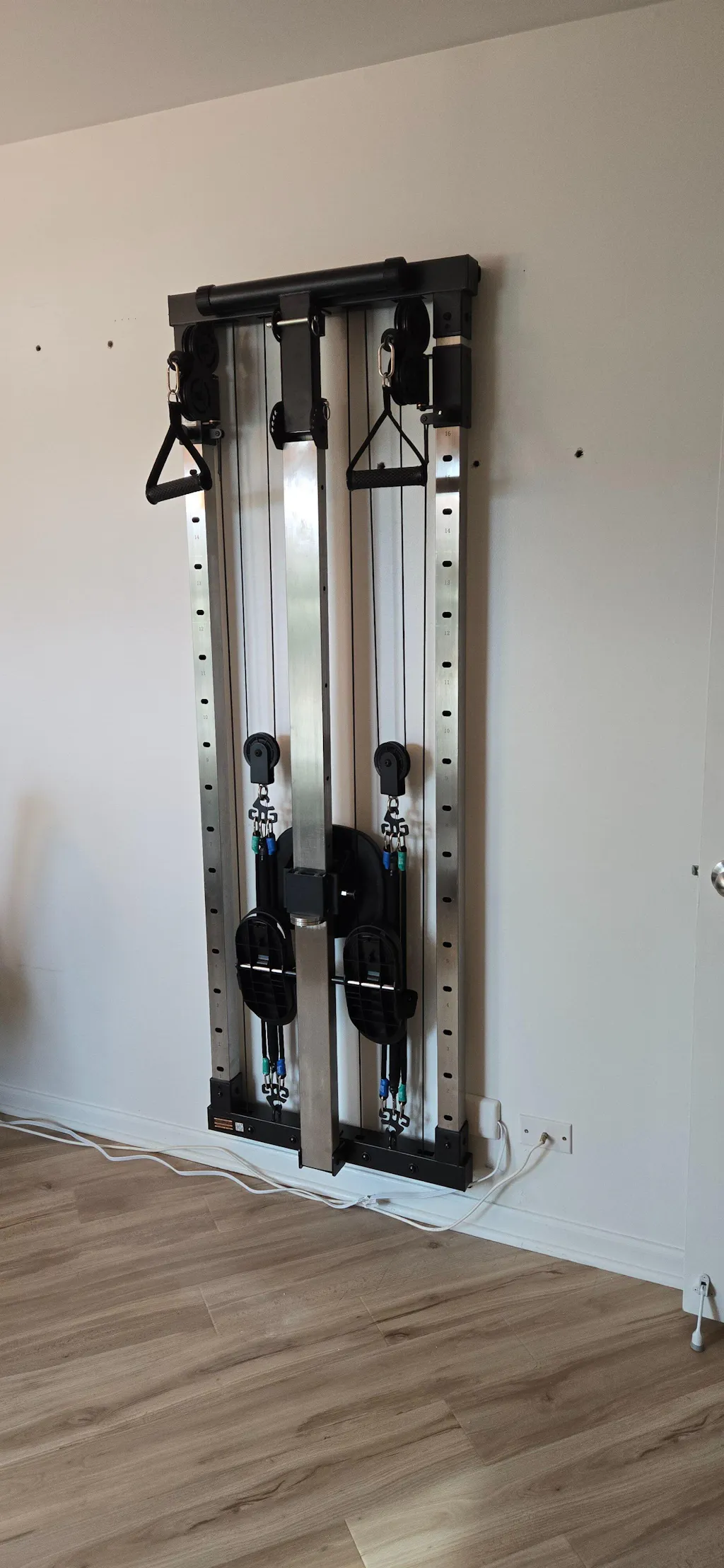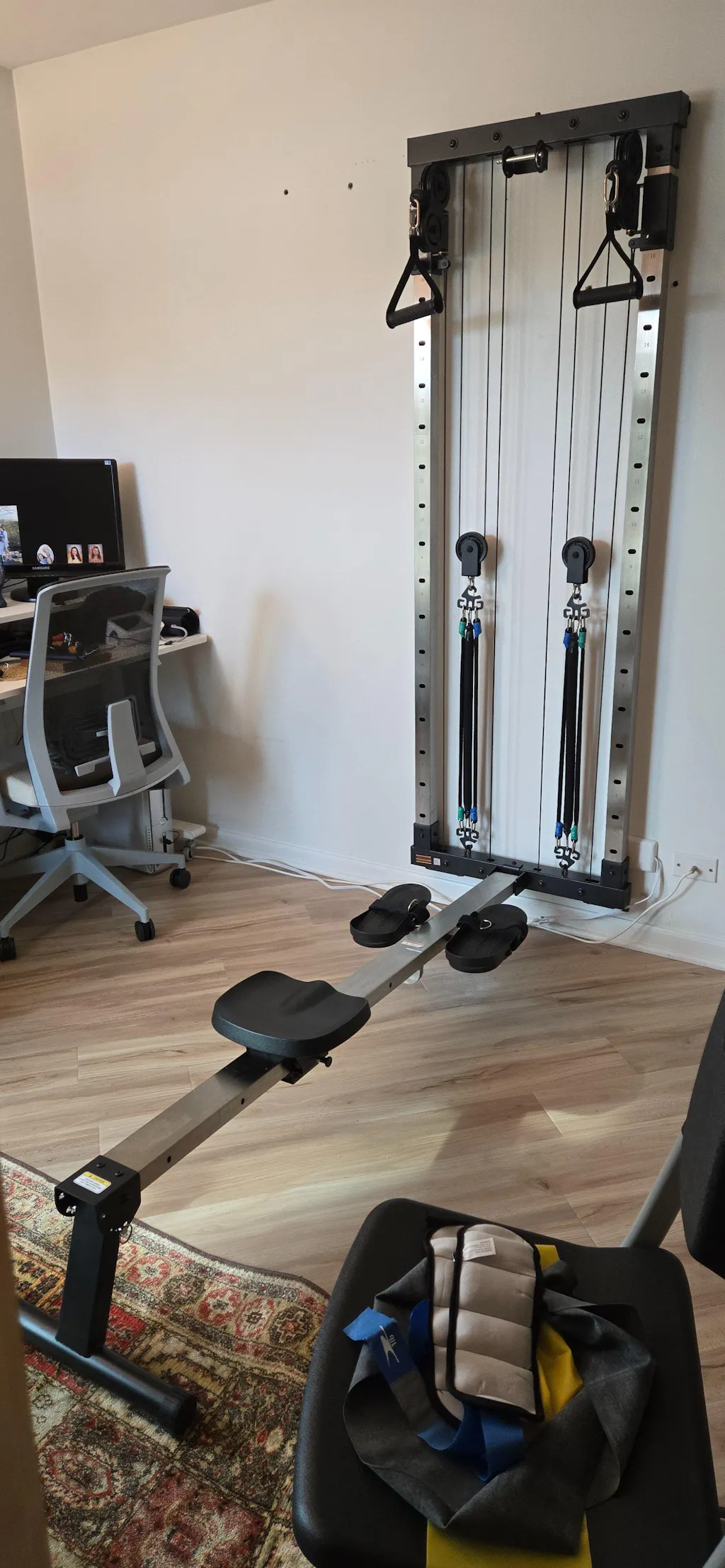 Compact, foldable dual pulley system designed for rowing exercises and a variety of resistance training movements. It provides smooth and quiet operation, perfect for space-saving home gyms. Its versatile design allows for effective full-body workouts while being easily stored when not in use.
