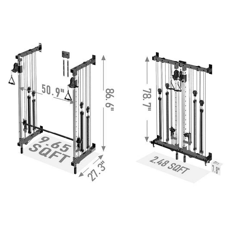The MF03 arrives pre-installed and pre-cabled, ready for wall mounting with no threading or complex assembly. Setup takes less than 30 minutes. The folding structure minimizes depth to 8.3 inches (2.93 sq. ft.) when stored and 27.3 inches (9.65 sq. ft.) when open, while still allowing use of two pulley stations even when folded.